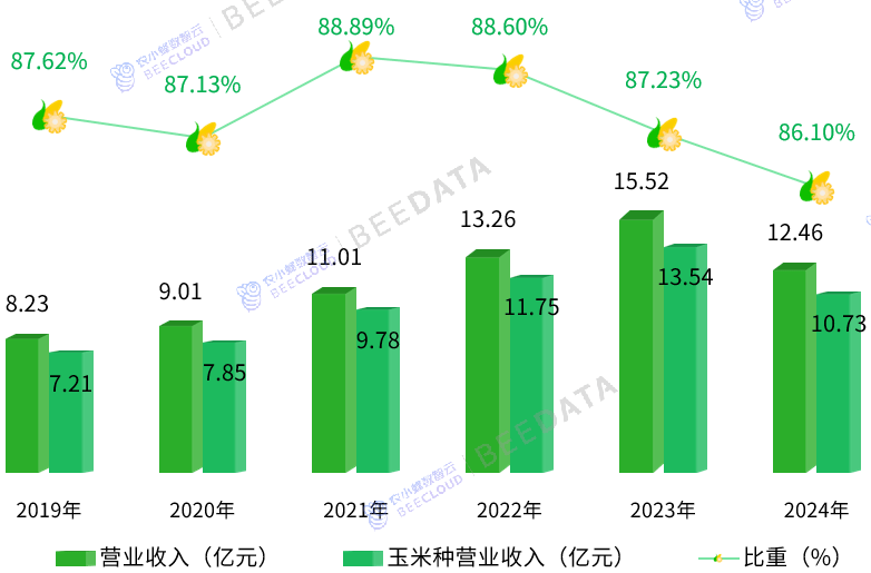 登海种业2024年实现停业收入12。46亿元,虽较2023年下降19。74%,但较2019年仍连结51。32%的增加,近6年年均复合增加率达7。15%。此中,玉米种子营业营收10。73亿元,同比下降20。78%,但较2019年增加48。71%,年均复合增加率为6。84%。玉米种子正在公司总营收中的比沉从2019年的87。62%小幅下降至2024年的86。10%,但一直维持正在80%以上,凸显其焦点营业地位。