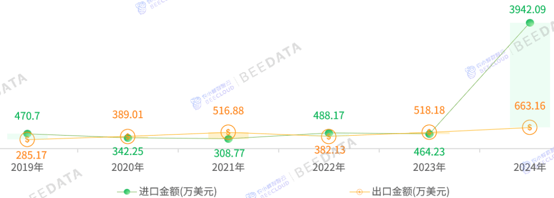 据中国海关数据显示,2019年至2024年期间,中国种用玉米商业呈现不变净出口款式。进口方面:年进口量维持正在236。89~496。53吨区间波动;出口方面:年出口规模达776。63~1533。71吨;进口量规模常年小于出口量规模,从2019年的280。1吨波动增加至2024年的1189。2吨,增幅达324。7%,此中2024年创下统计期内最高净出口记实。