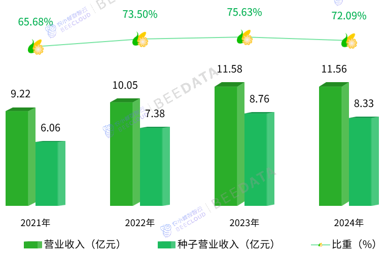 种子营业做为公司焦点板块表示凸起。2024年种子营业实现营收8。33亿元,虽较上年下降4。84%,但较2021年仍呈大幅增加趋向,增幅达37。58%,近三年年均复合增加率达到8。3%,显著高于公司全体增速。从营收布局来看,种子营业占比持续提拔,从2021年的65。68%增加至2024年的72。09%。