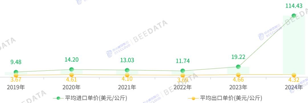 据中国海关数据显示,2019年~至今,中国种用玉米平均进口单价常年连结正在10美元/公斤以上,且远高于平均出口单价——根基都是平均出口单价的3倍以上;平均出口单价正在3。67~4。66美元/公斤之间不等,波动相对平缓。