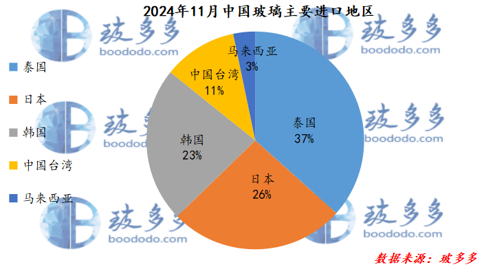 按照海关数据显示,2024年11月玻璃进口量为1。23万吨,同比-13%,同比增加1。12万吨,幅度6。25%。11月玻璃进口前三的地域是:泰国0。49万吨、韩国0。42万吨、日本0。29万吨,占比别离为33%、19%。