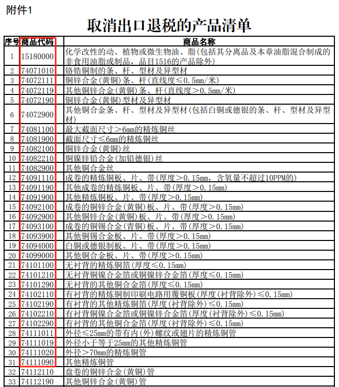关于打消出口退税的产物清单,总共包含59个产物,除了通知布告提到的产物,好比精辟铜管、铜板,其他铜合金条等,