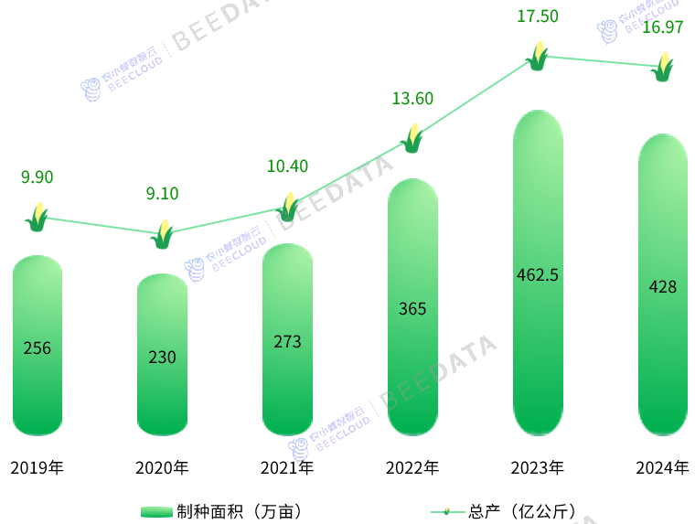 2024年,全国杂交玉米制种面积为428万亩,较2023年削减了34。5万亩,降幅约为7。46%,这是近五年来初次呈现面积回调。取2019年的256万亩比拟,近5年间增加了172万亩,增幅约为67。19%,年均复合增加率约为10。83%。