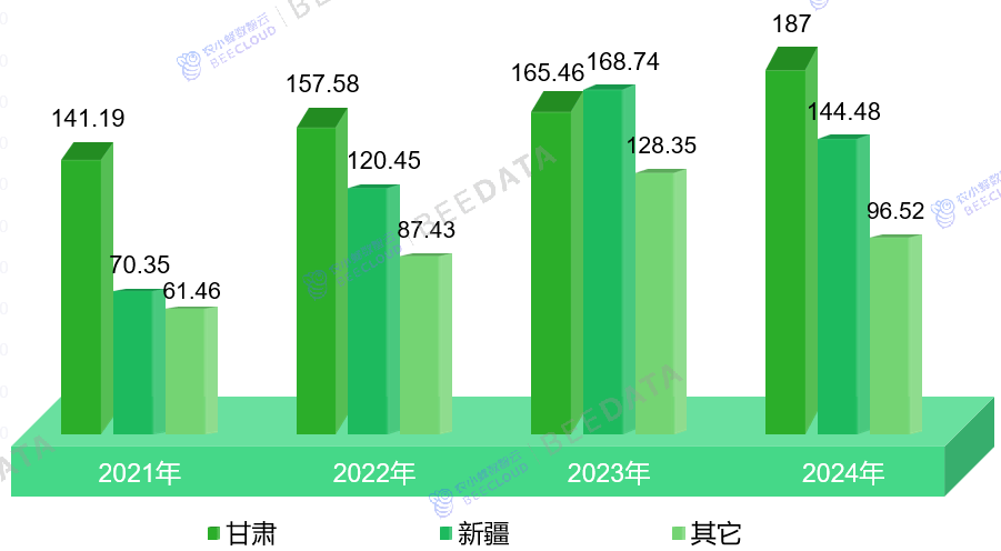 2024年,全国玉米制种面积已扩大至428万亩,较2021年增加56。78%。正在此期间,虽然甘肃和新疆仍连结从导地位,合计占比达77。45%,但区域款式呈现较着变化:甘肃制种面积增至187万亩,占比调整为43。69%;新疆则快速扩张至144。48万亩,占比提拔至33。76%。