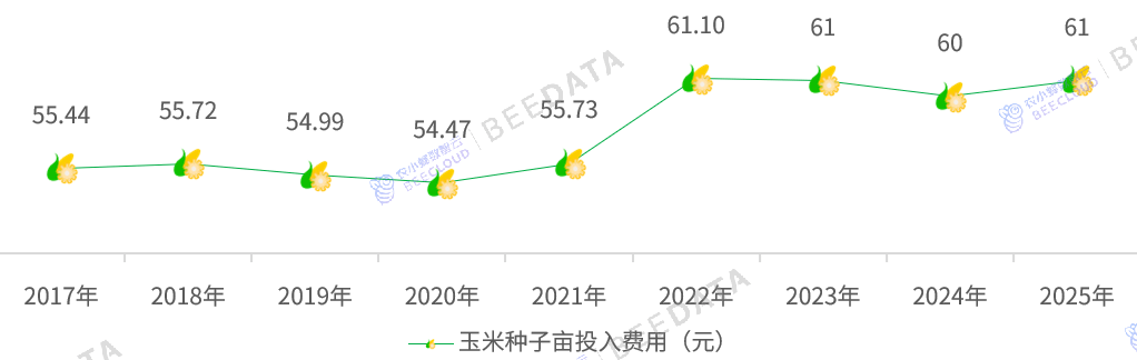 自2017年起,受研发成本上升、出产成本添加以及市场所作策略调整等多沉要素配合影响,我国玉米种子亩均投入呈现持续增加趋向。正在2017年至2025年期间,玉米种子亩均投入从55。44元逐渐提拔至61元,累计增加5。56元/亩,全体增幅达到10。03%,年均复合增加率为1。2%。这一增加态势反映了我国玉米种业正在手艺立异和市场成长方面的持续投入。