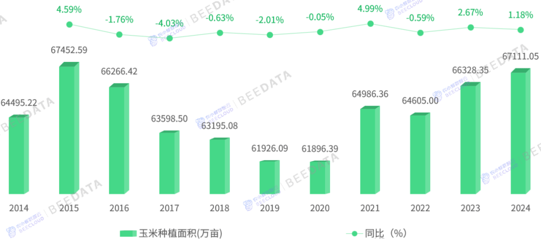 据国度统计局统计数据显示,2024年,中国玉米用种面积达67111。05万亩(约合6。71亿亩),同比力2023年添加了782。7万亩,近10年间添加2615。83万亩,增幅约为4。06%,年均复合增加率约为0。4%,我国玉米财产呈现持续不变的成长态势。