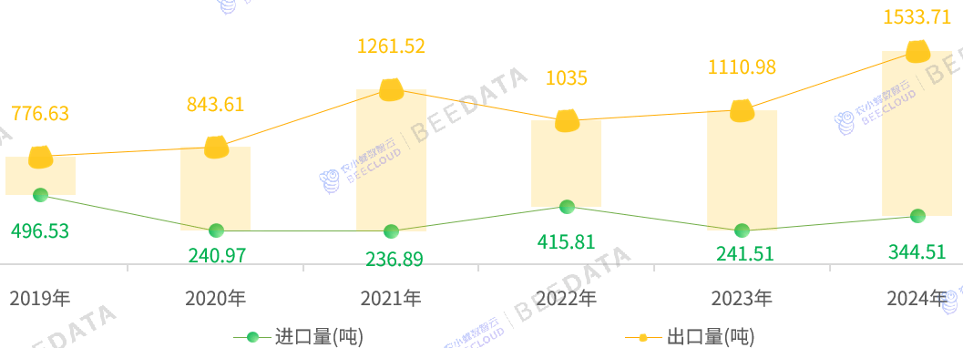 据中国海关数据显示,2019年至2024年期间,中国种用玉米商业呈现不变净出口款式。进口方面:年进口量维持正在236。89~496。53吨区间波动;出口方面:年出口规模达776。63~1533。71吨;进口量规模常年小于出口量规模,从2019年的280。1吨波动增加至2024年的1189。2吨,增幅达324。7%,此中2024年创下统计期内最高净出口记实。