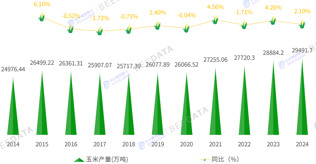 跟着玉米用种面积的添加,中国玉米产量也随之增加,据国度统计局数据显示,2024年中国玉米产量创汗青新高,达到29491。7万吨(约合2。95亿吨),同比增加了2。1%;取2014年的24976。44万吨比拟,近10年间增加了4515。26万吨,增幅约为18。08%,年均复合增加率约为1。68%。