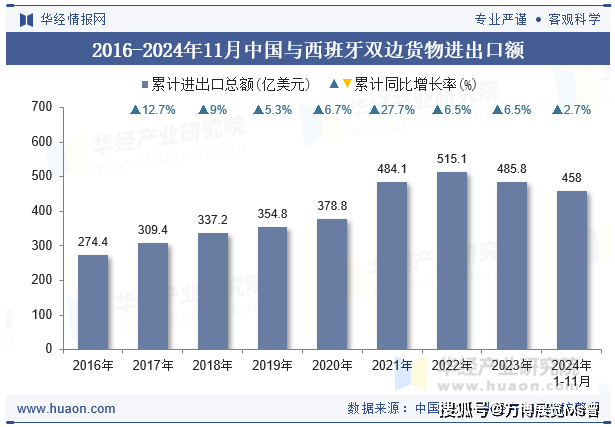 :2024年1-11月中国取西班牙双边货色进出口额为457。98亿美元,比拟上年同期增加了12。46亿美元,同比增加2。7%。进出口商品总值:2024年1-11月中国对西班牙出口商品总值为373。01亿美元,比拟上年同期增加了9。31亿美元,同比增加2。4%;中国自西班牙进口商品总值为84。97亿美元,比拟上年同期增加了3。15亿美元,同比增加4%。